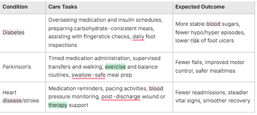 Different conditions call for specific caregiver tasks and measurable outcomes. The table below compares typical diabetes and Parkinson’s care tasks with expected results so families can see practical responsibilities at a glance.