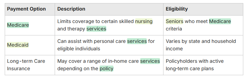 Medicare covers limited skilled nursing and certain therapies, but does not generally pay for long‑term custodial care. Medicaid can help cover personal care services for eligible individuals, with rules that vary by state. Families should review both programs and any state waivers that may apply.